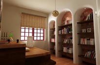 - 書房設計書房在住宅的總體格局中歸屬于工作區域,相當于家居的辦公室,而書房的合理布置則有利于建立良好的習作氛圍和環境;如采光、裝飾的材質、色彩、飾品、書籍的擺放等。